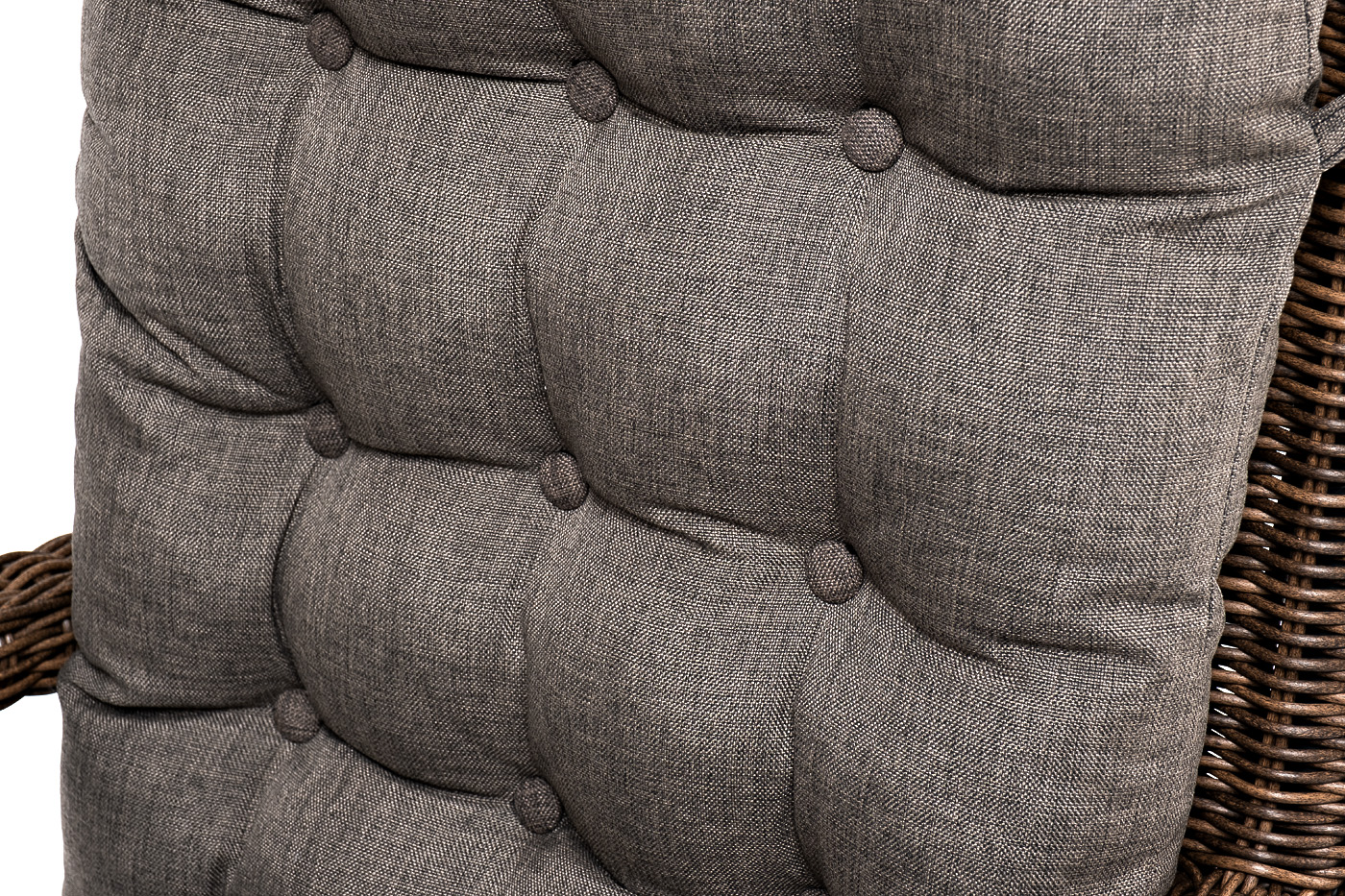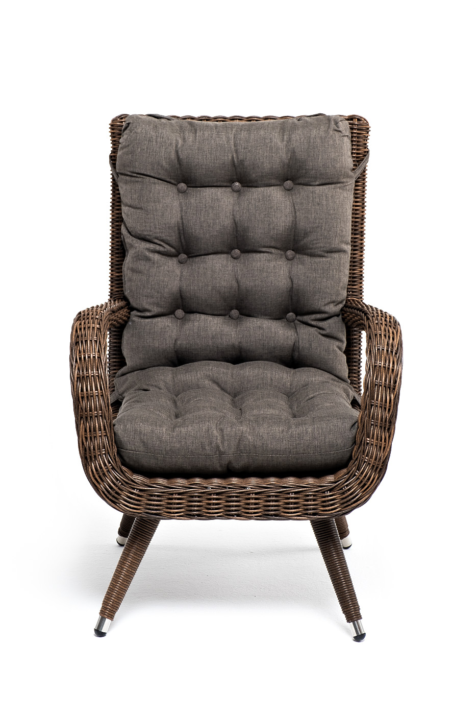 Садовое кресло дополнено мягкими подушками для комфортного размещения. Они выполнены в серо-коричневом цвете. При их пошиве используется полиэстер с плотностью 230гр/м2. Влагоотталкивающая пропитка усиливает защитные свойства материала.