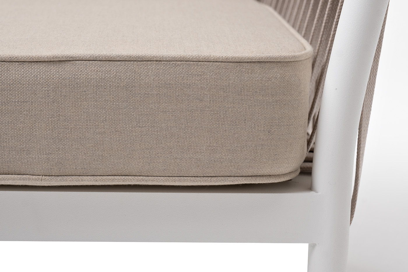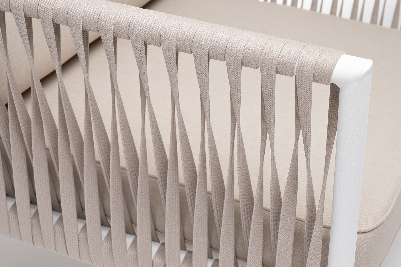 Кресло имеет алюминиевый каркас, окрашенный порошковой краской белового цвет. Боковины каркаса вручную оплетены роупом - эластичными синтетическими лентами, изготовленными из высокопрочных полиэфирных волокон. Цвет оплетки - бежевый.