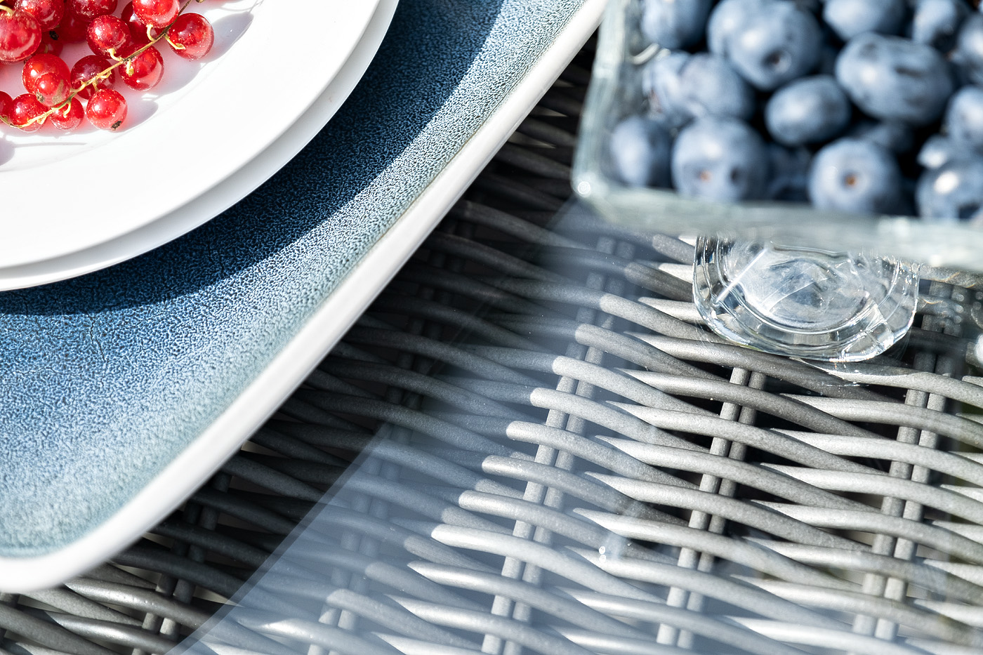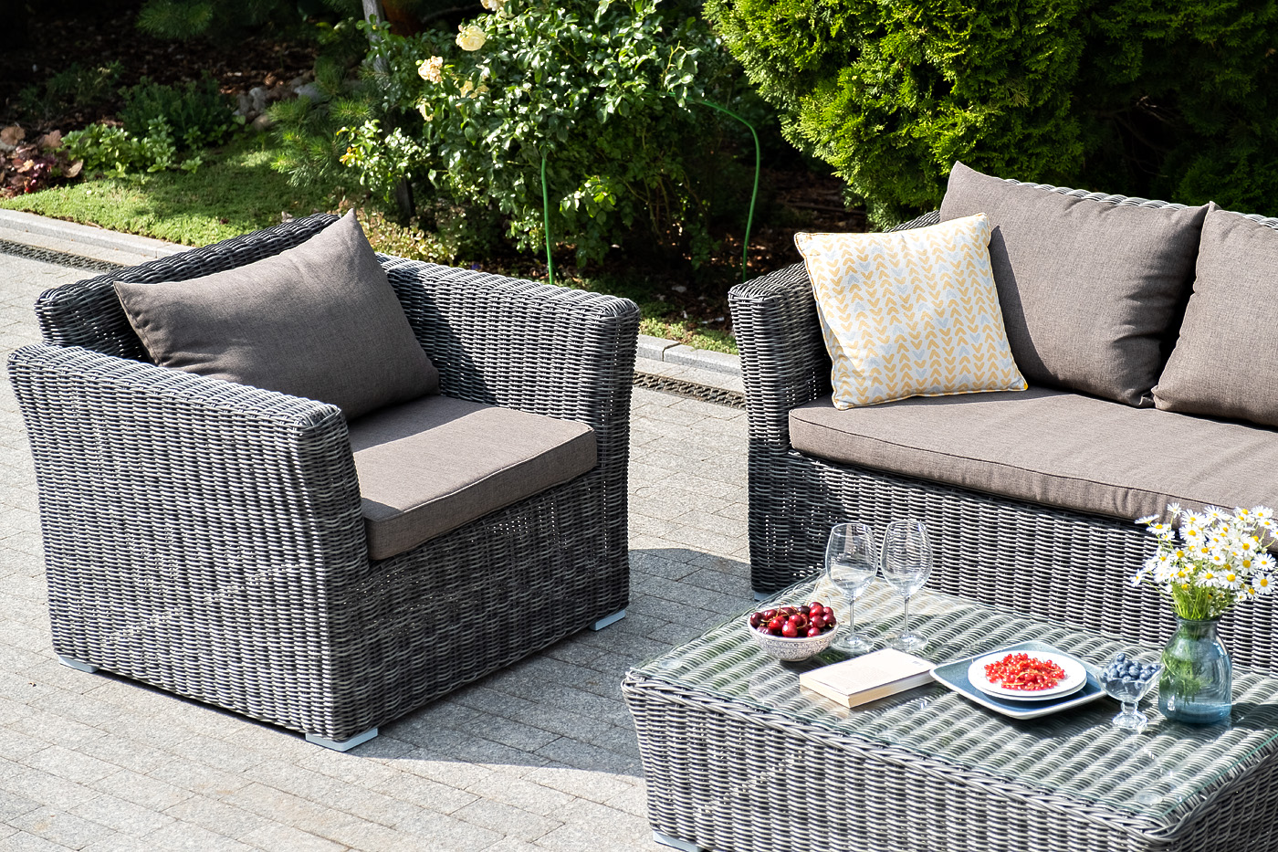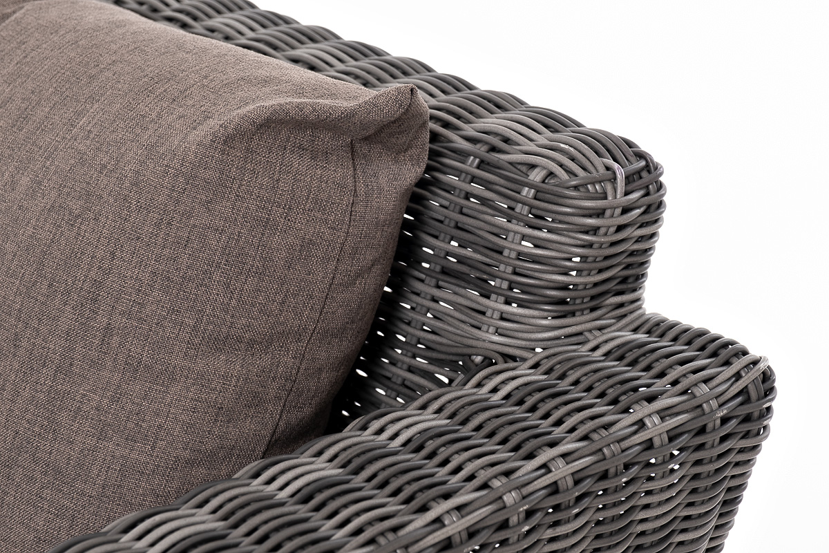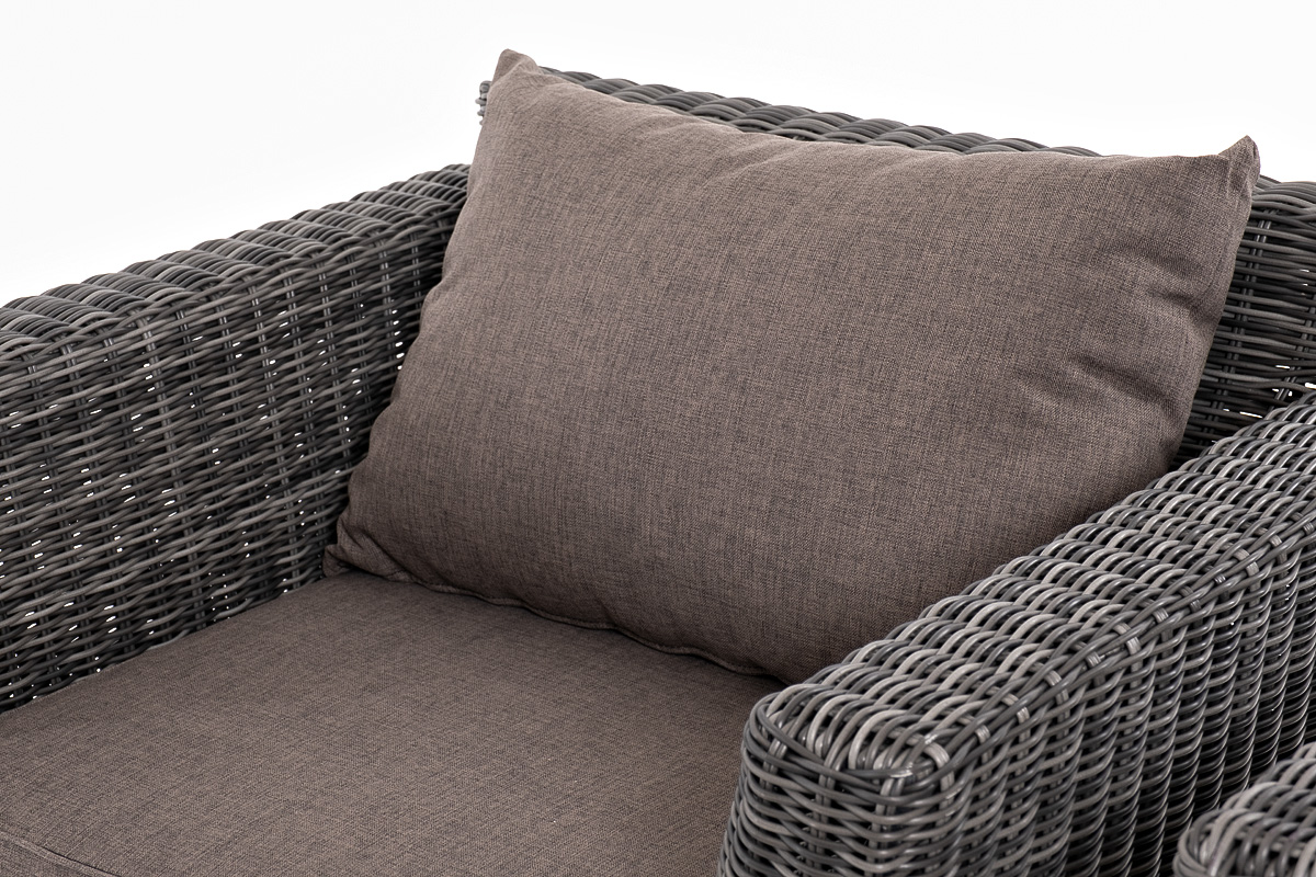 Из алюминия сделан устойчивый каркас мебели. Ее поверхность дополнена искусственным ротангом, из которого сделано ручное плетение, цвет "графит".