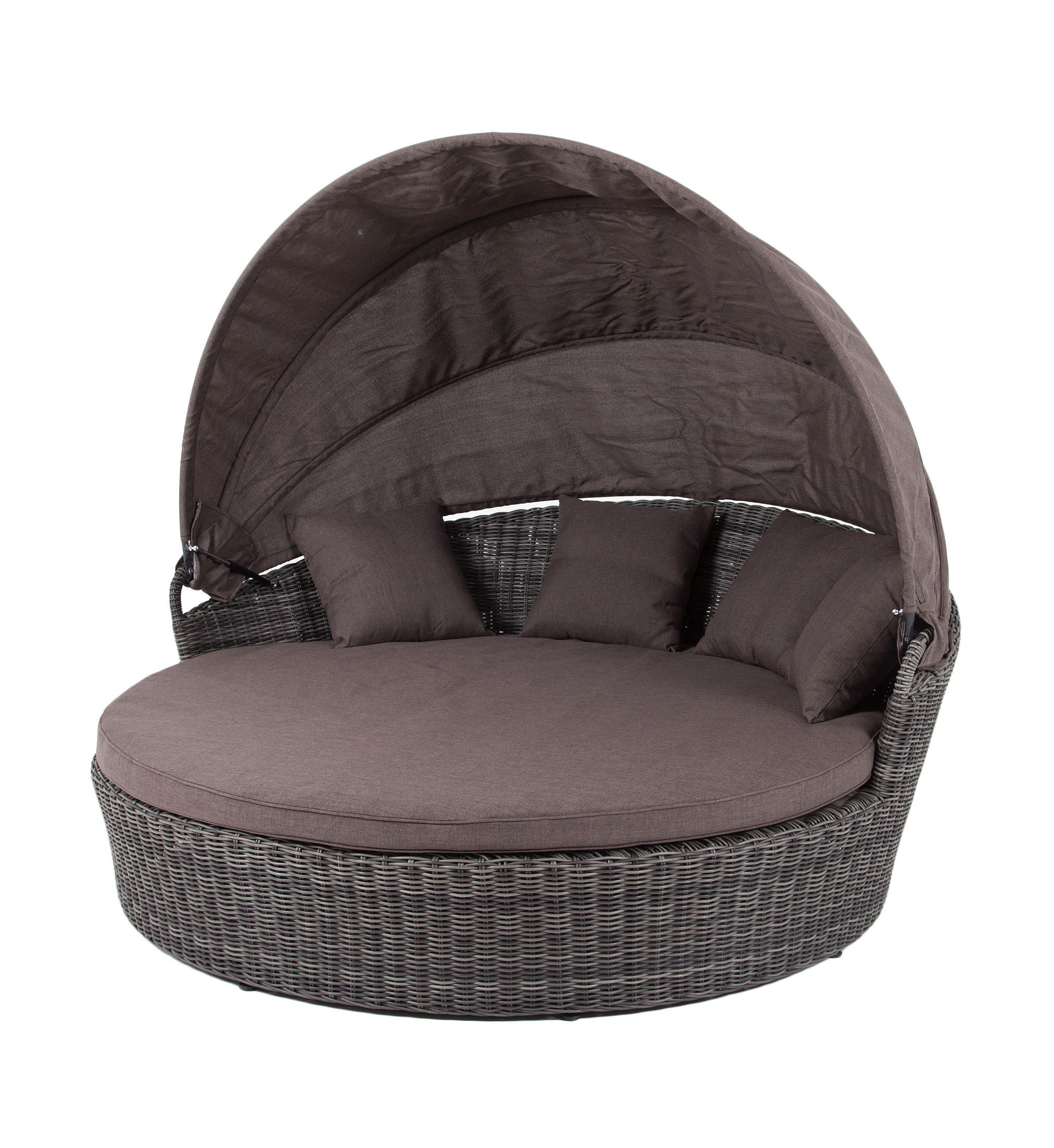 Данная модель имеет в основании прочный алюминиевый каркас, оплетенный вручную круглым ротангом и оснащена регулируемым козырьком, который ограничивает попадание солнечных лучей. Выполнен из водостойкой полиэфирной ткани.